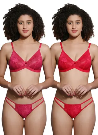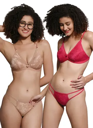 This is a pack of two full-coverage lingerie sets, available in four beautiful colors: purple, red, pink, and beige. Made from a high-quality, soft polyester fabric, this set feels smooth and is comfortable enough for all-day wear.